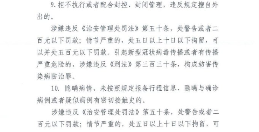 3月10日,合肥市司法局曾发布《违反疫情防控管理秩序的行为及法律后果明白纸》:隐瞒病情、未按照规定报备行程信息、隐瞒与确诊病例或者疑似病例有密切接触史的,涉嫌违反《治安管理处罚法》第五十条,处警告或者二百元以下罚款;情节严重的,处五日以上十日以下拘留,可以并处五百元以下罚款。引起新型冠状病毒传播或者有传播严重危险的,涉嫌违反《刑法》第三百三十条,构成妨害传染病防治罪。