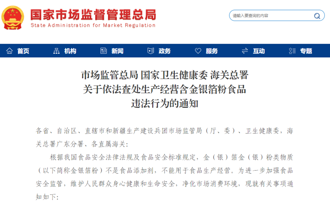 2022年1月,市场监管总局、国家卫生健康委、海关总署印发《关于依法查处生产经营含金银箔粉食品违法行为的通知》,明确提出:食品生产者不得采购使用金银箔粉生产加工食品;食品销售者不得采购销售含金银箔粉食品;餐饮服务提供者不得制作售卖含金银箔粉餐食;食品进口商不得进口含金银箔粉食品等。
