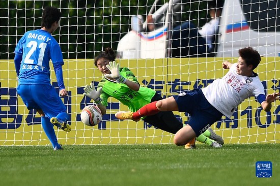 4月7日,武汉车谷江大队球员代陈颖(左)在比赛中射门。