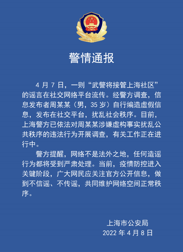 据“警民直通车-上海”消息,4月7日,一则“武警将接管上海社区”的谣言在社交网络平台流传。经警方调查,信息发布者周某某(男,35岁)自行编造虚假信息,发布在社交平台,扰乱社会秩序。目前,上海警方已依法对周某某涉嫌虚构事实扰乱公共秩序的违法行为开展调查,有关工作正在进行中。