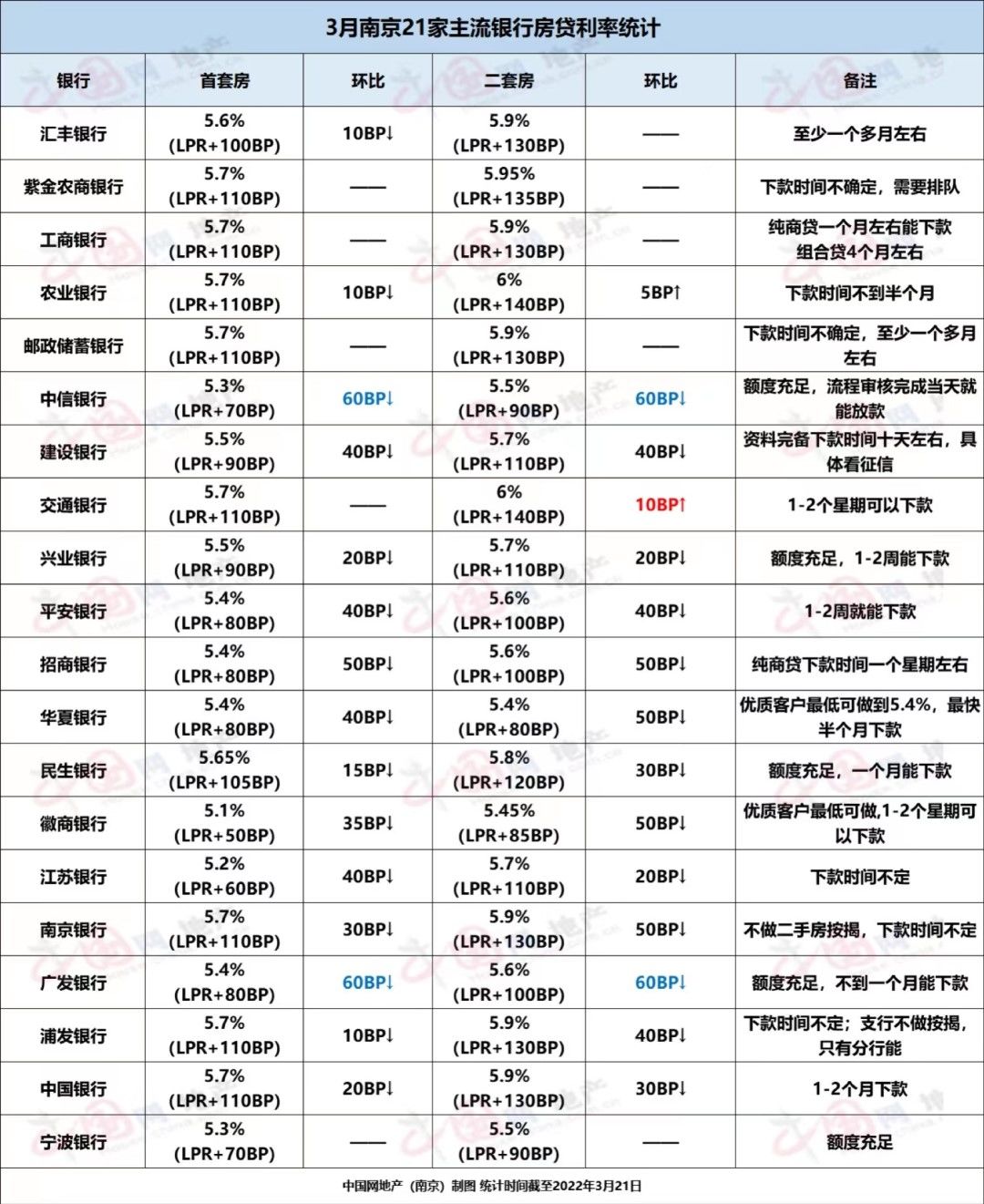 而在南京,3月份21家银行全面下调房贷利率,首套房利率普遍降至5.3-5.5%,最低仅5.1%;二套房利率普遍降至5.6-5.8%,最低仅5.4%!
