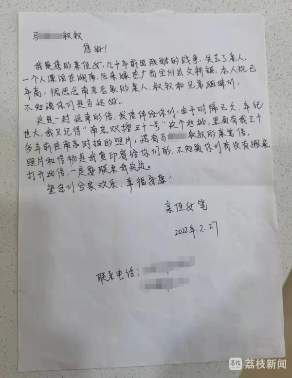 寄信的老人名叫周巧云,原姓马,今年84岁,她在抗日战争时期离开南京逃难到外地去了,寄信是想找到自己在南京的叔叔马桐荪及其家人。