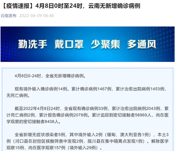截至2022年4月8日24时,全省现有确诊病例33例,累计治愈出院病例2043例,累计死亡病例2例,累计报告确诊病例2078例。累计追踪到密切接触者58969人,尚在医学观察的密切接触者8408人。