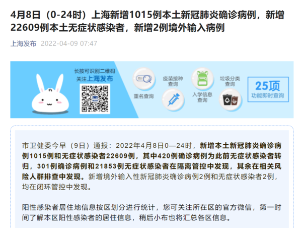 荔枝新闻讯 上海市卫健委今早(9日)通报:2022年4月8日0—24时,新增本土新冠肺炎确诊病例1015例和无症状感染者22609例,其中420例确诊病例为此前无症状感染者转归,301例确诊病例和21853例无症状感染者在隔离管控中发现,其余在相关风险人群排查中发现。新增境外输入性新冠肺炎确诊病例2例和无症状感染者2例,均在闭环管控中发现。