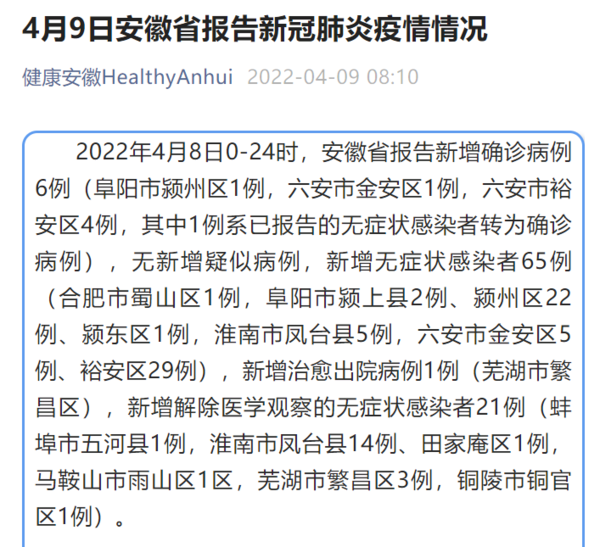 荔枝新闻讯 据“健康安徽HealthyAnhui”微信号消息,2022年4月8日0-24时,安徽省报告新增确诊病例6例(阜阳市颍州区1例,六安市金安区1例,六安市裕安区4例,其中1例系已报告的无症状感染者转为确诊病例),无新增疑似病例,新增无症状感染者65例(合肥市蜀山区1例,阜阳市颍上县2例、颍州区22例、颍东区1例,淮南市凤台县5例,六安市金安区5例、裕安区29例),新增治愈出院病例1例(芜湖市繁昌区),新增解除医学观察的无症状感染者21例(蚌埠市五河县1例,淮南市凤台县14例、田家庵区1例,马鞍山市雨山区1区,芜湖市繁昌区3例,铜陵市铜官区1例)。