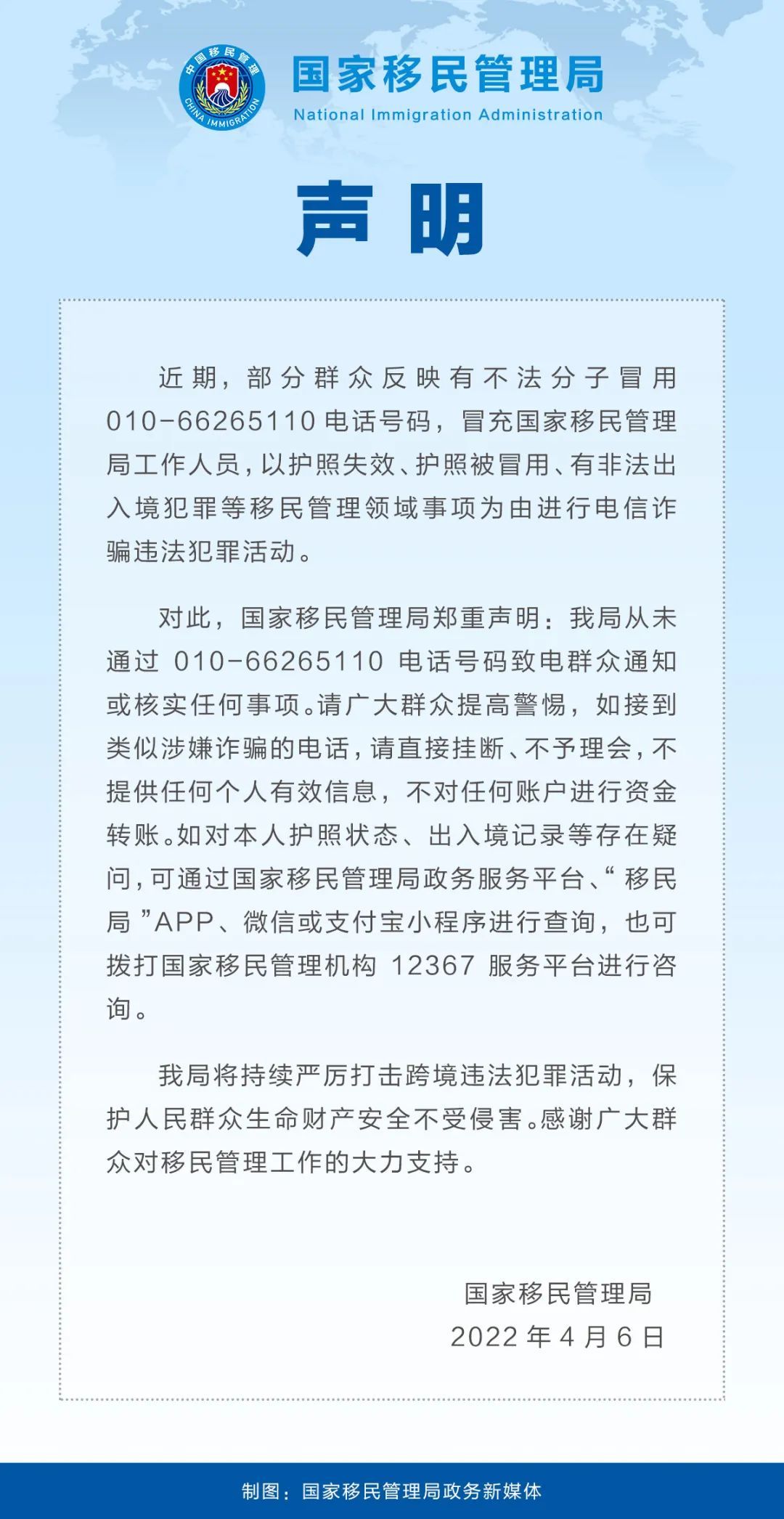 4月6日,国家移民管理局官方微信发布声明称,近期,部分群众反映有不法分子冒用010-66265110电话号码,冒充国家移民管理局工作人员,以护照失效、护照被冒用、有非法出入境犯罪等移民管理领域事项为由进行电信诈骗违法犯罪活动。