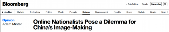 当地时间4月6日,彭博社发布了一篇题为《爱国网友让正在塑造对外形象的中国陷入两难》的文章,声称中国网友爱国、“反美”等言论和舆论趋势,损害了中国正在对外塑造的和善低调、负责任的大国形象。这究竟是怎么回事?