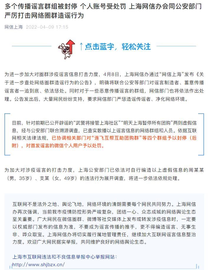 为进一步加大对圈群涉疫谣言信息打击力度,4月8日,上海网信办通过“网信上海”发布《关于进一步查处网络圈群造谣行为的公告》,明确将联合公安等部门对谣言制造者、蓄意传播谣言者一追到底、依法惩处。同时对于一些恶意传播谣言的群组,网信部门也将依法作出处理。公告发出后,大量网民纷纷支持,要求网信部门严惩造谣传谣者、净化网络环境。