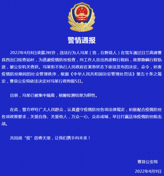 荔枝新闻讯 @曹县公安消息,2022年4月8日凌晨2时许,违法行为人冯某(男,巨野县人)在驾车通过日兰高速曹县西出口检查站时,为逃避疫情防控检查,向工作人员出具虚假行程码,故意隐瞒行程轨迹,被公安机关查获。冯某拒不执行人民政府在紧急状态下依法发布的决定、命令,妨害疫情防控期间的社会管理秩序,根据《中华人民共和国治安管理处罚法》第五十条之规定,曹县公安局依法决定对冯某行政拘留5日。