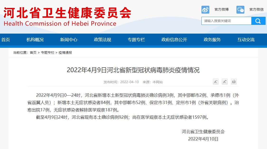 荔枝新闻讯 据河北卫健委消息,2022年4月9日0—24时,河北省新增本土新型冠状病毒肺炎确诊病例3例,其中邯郸市2例、承德市1例(外省返冀人员);新增本土无症状感染者84例,其中邯郸市52例、保定市31例、定州市1例(外省关联病例)。治愈出院17例,无症状感染者解除医学观察187例。