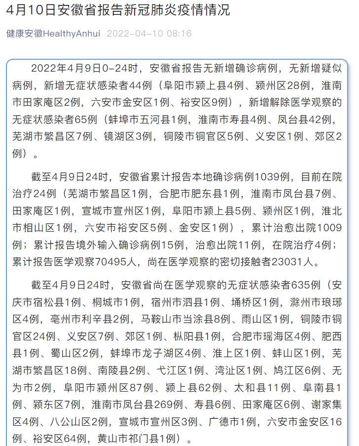 截至4月9日24时,安徽省累计报告本地确诊病例1039例,目前在院治疗24例(芜湖市繁昌区1例,合肥市肥东县1例,淮南市凤台县7例、田家庵区1例,宣城市宣州区1例,阜阳市颍上县5例、颍州区1例,淮北市相山区1例,六安市裕安区5例、金安区1例),累计治愈出院1009例;累计报告境外输入确诊病例15例,治愈出院11例,在院治疗4例;累计报告医学观察70495人,尚在医学观察的密切接触者23031人。