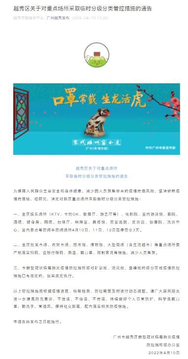荔枝新闻讯 据广州越秀发布微信公众号4月10日消息,越秀区发布关于对重点场所采取临时分级分类管控措施的通告。全文如下: