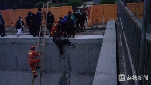 先期到达现场的民警发现,男子掉落在水深较浅的台阶处,男子称其掉下去时可能摔伤了左腿,现在无法动弹,加上男子所在的位置距离岸上约有5、6米深的落差,民警无奈只得请求消防救援人员前来增援。