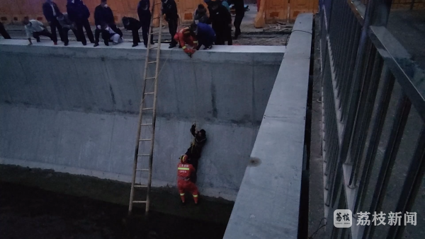 我苏网讯 4月7日18时许,在徐州市云龙区袁桥闸附近,有一名男子不慎落水,由于5、6米深和河沟非常陡峭,最终,消防队员和民警联手,终将男子从河沟里营救上岸。