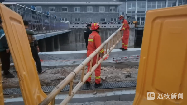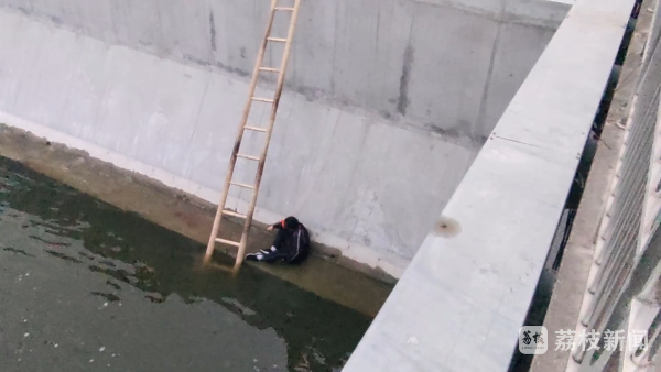 辖区凤凰山消防救援站接警后立刻出动前往救援,消防救援人员找来长梯,将梯子放入河道中,一名消防员在系好安全绳索后,顺着梯子下到男子的身边。