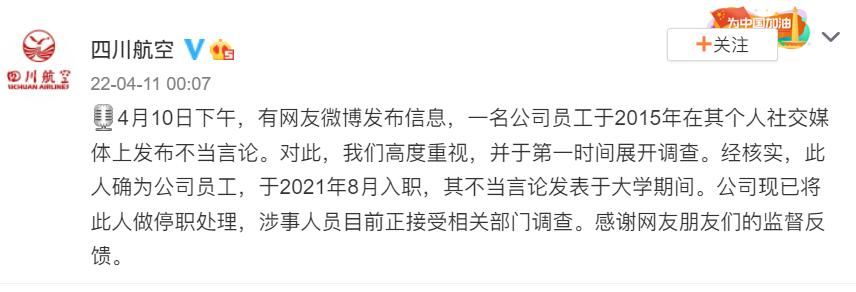 荔枝新闻讯 据@四川航空 微博消息,4月10日下午,有网友微博发布信息,一名公司员工于2015年在其个人社交媒体上发布不当言论。对此,四川航空高度重视,并于第一时间展开调查。经核实,此人确为公司员工,于2021年8月入职,其不当言论发表于大学期间。公司现已将此人做停职处理,涉事人员目前正接受相关部门调查。感谢网友朋友们的监督反馈。