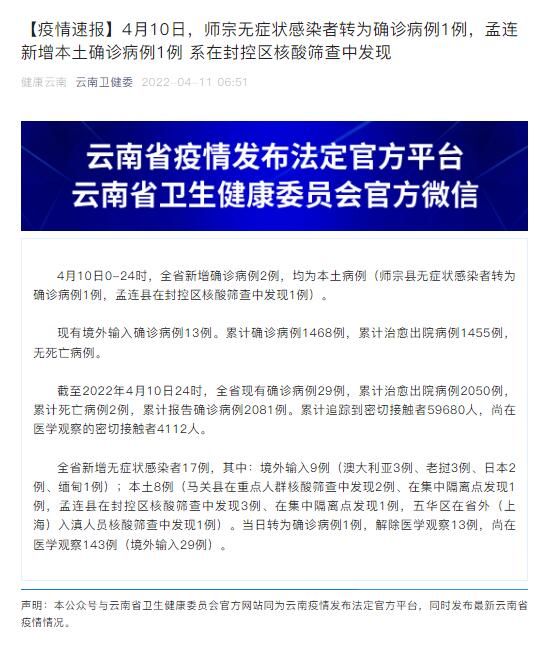 全省新增无症状感染者17例,其中:境外输入9例(澳大利亚3例、老挝3例、日本2例、缅甸1例);本土8例(马关县在重点人群核酸筛查中发现2例、在集中隔离点发现1例,孟连县在封控区核酸筛查中发现3例、在集中隔离点发现1例,五华区在省外(上海)入滇人员核酸筛查中发现1例)。当日转为确诊病例1例,解除医学观察13例,尚在医学观察143例(境外输入29例)。