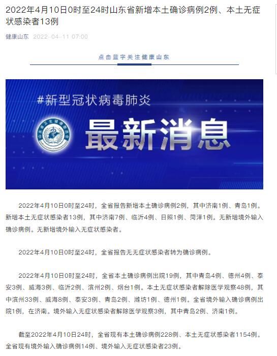 荔枝新闻讯 据健康山东微信公众号消息,2022年4月10日0时至24时,全省报告新增本土确诊病例2例,其中济南1例、青岛1例。新增本土无症状感染者13例,其中济南7例、临沂4例、日照1例、菏泽1例。无新增境外输入确诊病例。无新增境外输入无症状感染者。