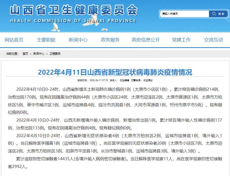 2022年4月10日0-24时,山西省新增无症状感染者4例(太原市万柏林区2例、运城市临猗县1例、境外输入1例)。当日解除医学隔离1例(运城市临猗县1例)。尚在医学观察的无症状感染者20例(太原市小店区7例、太原市迎泽区2例、太原市万柏林区3例、阳泉市平定县1例、长治市黎城县1例、运城市临猗县3例、境外输入3例)。