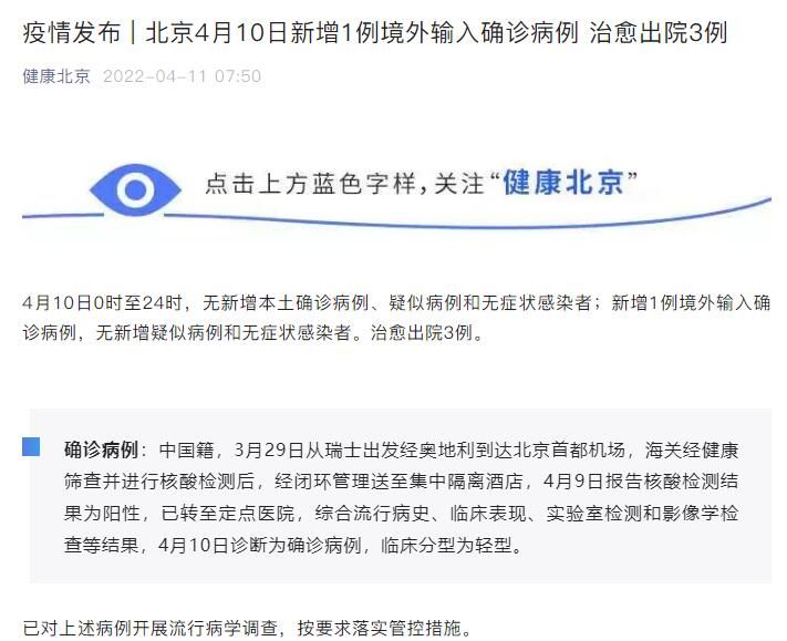荔枝新闻讯 据健康北京微信公众号消息,4月10日0时至24时,无新增本土确诊病例、疑似病例和无症状感染者;新增1例境外输入确诊病例,无新增疑似病例和无症状感染者。治愈出院3例。