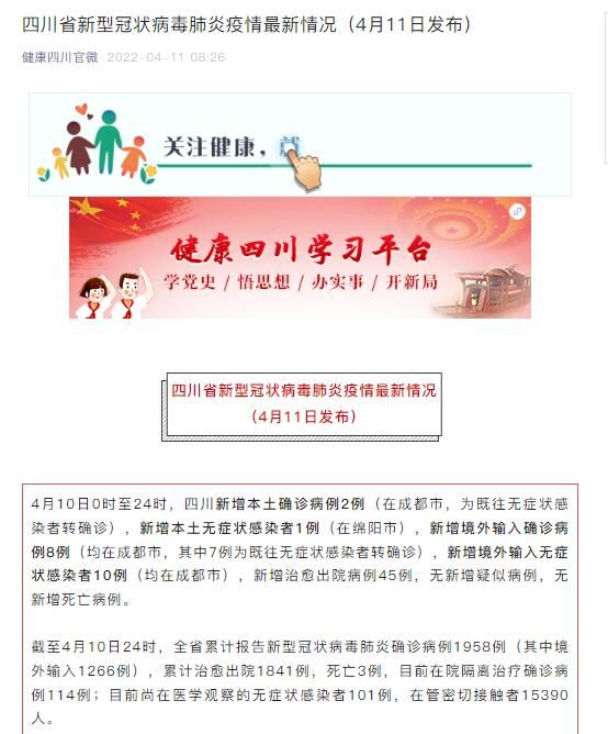 荔枝新闻讯 据健康四川官微消息,4月10日0时至24时,四川新增本土确诊病例2例(在成都市,为既往无症状感染者转确诊),新增本土无症状感染者1例(在绵阳市),新增境外输入确诊病例8例(均在成都市,其中7例为既往无症状感染者转确诊),新增境外输入无症状感染者10例(均在成都市),新增治愈出院病例45例,无新增疑似病例,无新增死亡病例。