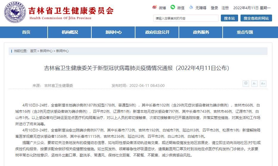 4月10日0-24时,吉林省新增治愈出院确诊病例977例,其中长春市772例、吉林市192例、白城市7例、延边州3例、四平市2例、松原市1例;新增解除隔离医学观察无症状感染者1358例,其中长春市1115例、吉林市236例、延边州2例、四平市2例、白山市2例、白城市1例。