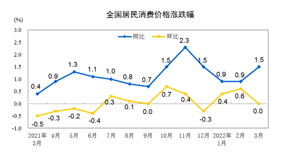 2022年3月份,全国居民消费价格同比上涨1.5%。其中,城市上涨1.6%,农村上涨1.2%;食品价格下降1.5%,非食品价格上涨2.2%;消费品价格上涨1.7%,服务价格上涨1.1%。1—3月平均,全国居民消费价格比上年同期上涨1.1%。