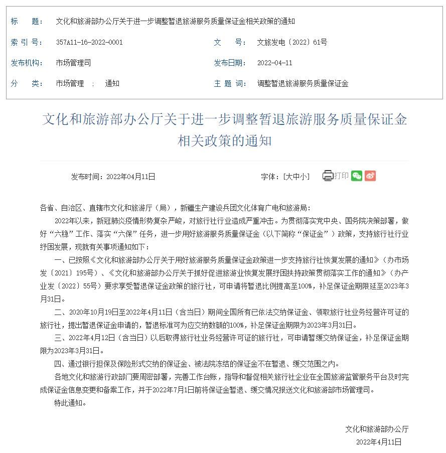 荔枝新闻讯 据4月11日,据中华人民共和国文化和旅游部官网消息,文化和旅游部办公厅印发《关于进一步调整暂退旅游服务质量保证金相关政策的通知》。《通知》指出,2022年以来,新冠肺炎疫情形势复杂严峻,对旅行社行业造成严重冲击。为贯彻落实党中央、国务院决策部署,做好“六稳”工作、落实“六保”任务,进一步用好旅游服务质量保证金(以下简称“保证金”)政策,支持旅行社行业纾困发展,文化和旅游部决定,旅行社可全额暂退保证金或暂缓交纳,补足保证金期限延至2023年3月31日。