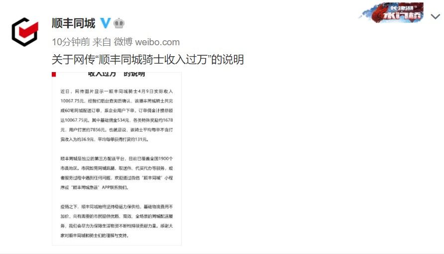 荔枝新闻讯 4月11日晚间,@顺丰同城 发布关于网传“顺丰同城骑士收入过万”的说明称,近日,网传图片显示一顺丰同城骑士4月9日实际收入10067.75元,经后台查询后确认,该顺丰同城骑士共完成60笔同城配送订单,系企业用户下单,订单佣金计提总额达10067.75元。其中基础佣金534元,各类特殊奖励约1678元,用户打赏约7856元。也就是说,该骑士平均每单不含打赏收入为约36.9元,平均每单获得打赏约131元。