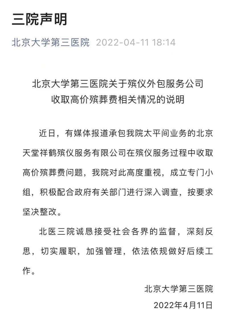 荔枝新闻讯 “北京大学第三医院”微信公众号11日发布殡仪外包服务公司收取高价殡葬费相关情况的说明如下: