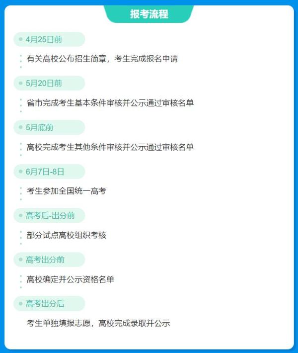 根据教育部公布的报考流程,4月25日前完成报名申请,5月20日前省市完成考生基本条件审核并公示通过审核名单,5月底前高校完成考生其他条件审核并公示通过审核名单,高考后、出分前,部分试点高校组织考核,高考出分前高校确定并公示资格名单,高考出分后考生单独填报志愿,高校在提前批次完成录取并公示。