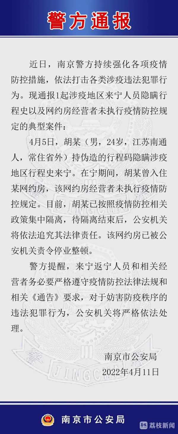 今天(4月11日)上午,南京警方通报一起涉疫地区来宁人员隐瞒行程史以及网约房经营者未执行疫情防控规定的典型案件。