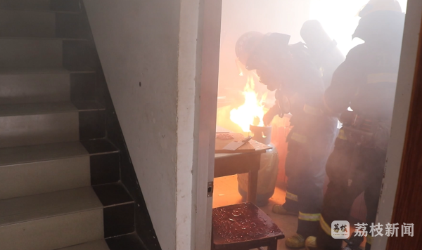 接到报警后,镇江丹阳消防救援大队出动5名消防救援人员,赶到了丹阳市开发区前艾胡墙村12号居民家中。到达现场后,消防救援人员发现,厨房内的液化气瓶正喷着火焰,烟雾弥漫,现场可以闻到浓烈的煤气味。消防救援人员第一时间疏散了围观群众,断开液化气罐与煤气灶链接,并拿出水枪对液化气瓶身喷水,进行冷却处理。“因为液化气罐燃烧持续时间长,无法完全关闭燃烧的液化气罐的阀门,我们只能将冒火的液化气罐拿到空旷的地带,用水枪降温后,将明火扑灭。”消防救援人员吴晨旻说。
