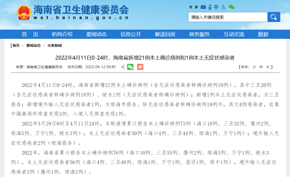 2022年3月29日0时至4月11日24时,本轮疫情累计报告本土确诊病例73例(海口10例、三亚52例、儋州2例、琼海5例、万宁1例、陵水3例);本土无症状感染者50例(海口4例、三亚44例、琼海1例、万宁1例);境外输入无症状感染者2例(琼海报告)。