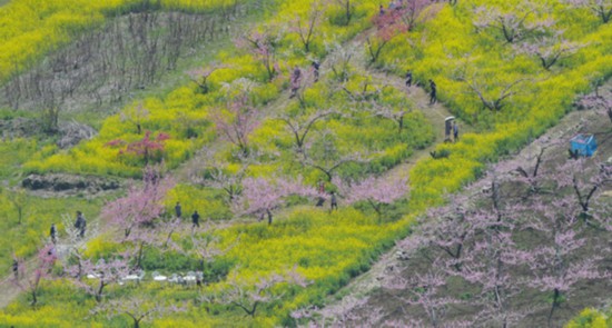 桃花、油菜花同时开放,游客们在花海中尽情欣赏美景。(图片来源:《朝日新闻》网站)