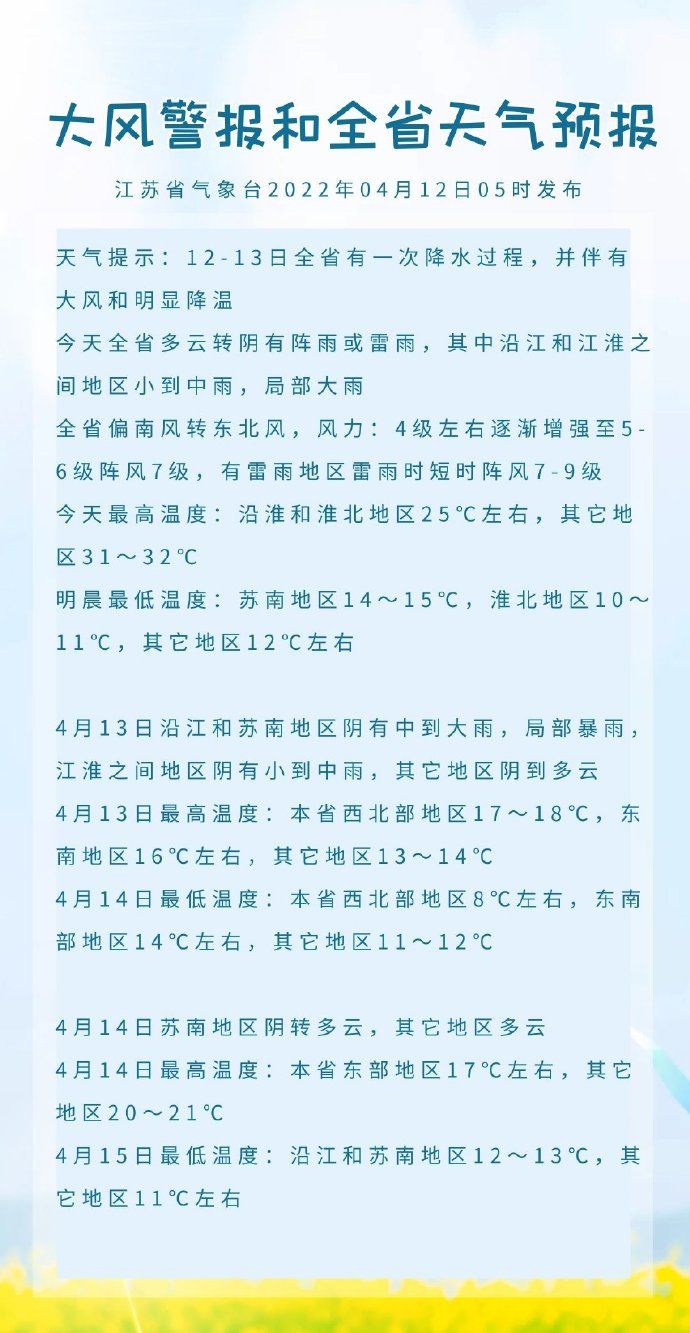 12日中午开始风力逐渐增强,陆上阵风可达6~7级,江河湖面8级左右,南通沿海海面9~10级,盐城和连云港沿海海面8~9级。