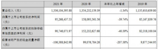 昨日晚间,双乐股份(301036.SZ)发布了上市后的首份年报。2021年,该公司实现营业收入13.36亿元,同比减少1.34%%;实现归属于上市公司股东的净利润9526.84万元,同比减少39.74%;实现归属于上市公司股东的扣除非经常性损益的净利润9074.61万元,同比减少40.39%;经营活动产生的现金流量净额为-1.06亿元,同比减少207.38%。