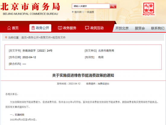 中国网财经4月12日讯 据北京市商务局网站消息,北京市商务局印发《关于实施促进绿色节能消费政策的通知》(简称《通知》)。《通知》指出,北京市自2022年4月开始,面向在京消费者发放绿色节能消费券,鼓励消费者购买使用绿色节能商品。实施时间为2022年4月18日至9月30日。