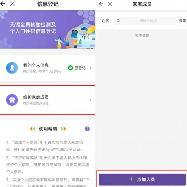 由家人、亲友通过“灵锡”APP-【门铃码】-【个人门铃码】-【维护家庭成员】中完成信息维护,上传本人照片并保存打印“个人门铃码”(也可以直接打印后粘贴本人照片)。