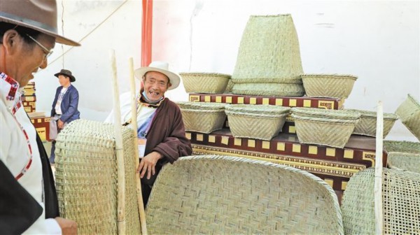 图为尼屋乡农牧民曲加在第七届“尼屋桃花节”特色产品展销区域售卖自己手工编织的竹筐。记者 万靖 通讯员 索朗 摄