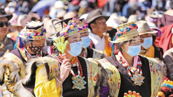 图为在第七届“尼屋桃花节”开幕式上,身穿民族服装的当地群众。 记者 万靖 通讯员 平措卓玛 摄