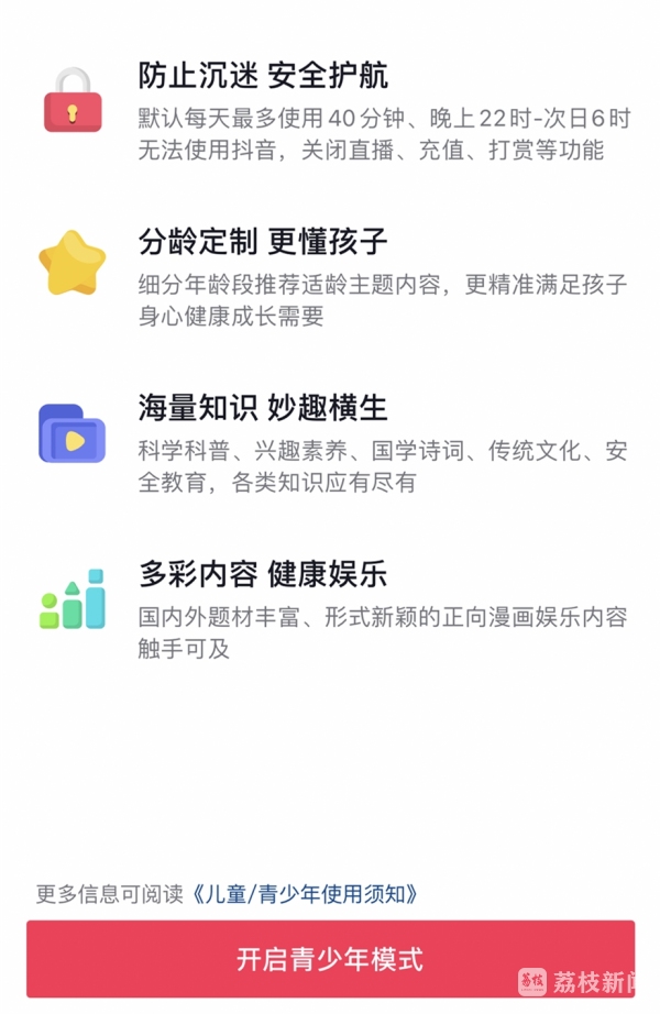 记者了解到,"青少年防沉迷系统"即"青少年模式"去年起已在部分视频和直播平台上线,已对未启用青少年模式的14周岁以下实名认证未成年人用户直接进入青少年模式。在青少年模式下,用户无法进行直播、打赏、充值等操作,也会自动开启时间锁,每天使用时长不超过40分钟,晚上10点至次日早上6点无法使用APP。