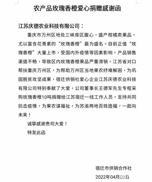 “江苏省对口帮扶重庆万州区,为帮助万州区当地果农纾难解困,为巩固脱贫攻坚成果,爱心企业江苏庆德农业科技有限公司特别奉献了大爱……支持共同抗击疫情,为果农谋福祉,为苏渝两地百姓造福。”4月9日,宿迁市供销总社为该公司发来了感谢函。