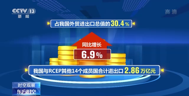 我国与RCEP其他14个成员国合计进出口2.86万亿元,同比增长6.9%,占我国外贸进出口总值的30.4%。
