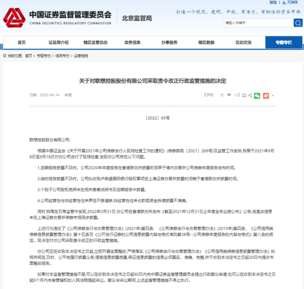 荔枝新闻讯 据北京证监局网站消息,4月14日,北京证监局发布《关于对联想控股股份有限公司采取责令改正行政监管措施的决定》。决定显示,北京证监局于2021年9月8日至9月18日对联想控股进行了现场检查,发现存在定期报告披露不及时,临时报告披露不及时等问题。