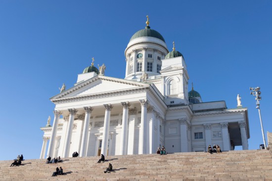 3月16日,人们在芬兰赫尔辛基大教堂前的台阶上享受暖阳。新华社发(马蒂·马蒂凯宁摄)