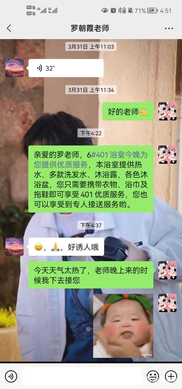 “亲爱的罗老师,6号楼401浴室今晚为您提供优质服务,本浴室提供热水、多款洗发水、沐浴露,各色沐浴盆,您只需要携带衣物、浴巾及拖鞋即可享受401优质服务,您也可以享受到专人接送服务哟。”这是扬州市职业大学旅游学院罗朝霞老师收到的一条微信,短短的几行字让罗老师感动不已:“昨天在走访宿舍时跟同学们提到住校洗澡不方便,只能用桶拎水到卫生间隔间洗澡,今天同学们就给我发来了这样一条短信,真的是太暖心了。”