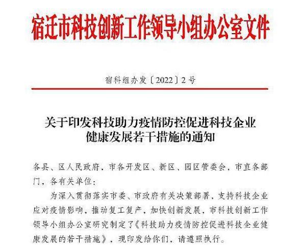 4月8日,宿迁市出台《科技助力疫情防控促进科技企业健康发展的若干措施》。措施明确,落实科创载体房租减免,对疫情防控中表现突出的科技企业,优先支持其建设省级以上研发机构、转化重大科技成果。