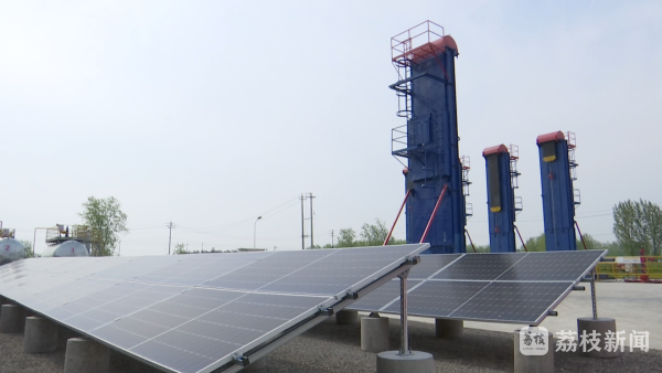 像这样的注气单元,江苏油田共有17个,覆盖储量超千万吨。通过科技赋能,如今江苏油田最高的区块能达到1吨二氧化碳能产出换1吨油,实现了封碳与增油双赢,获得了良好的经济效益与社会效益。除此之外,为追求“零排放”,在井场空地,一块块太阳能发电板,正源源不断的生产着绿色能源,驱动着采油机运作。