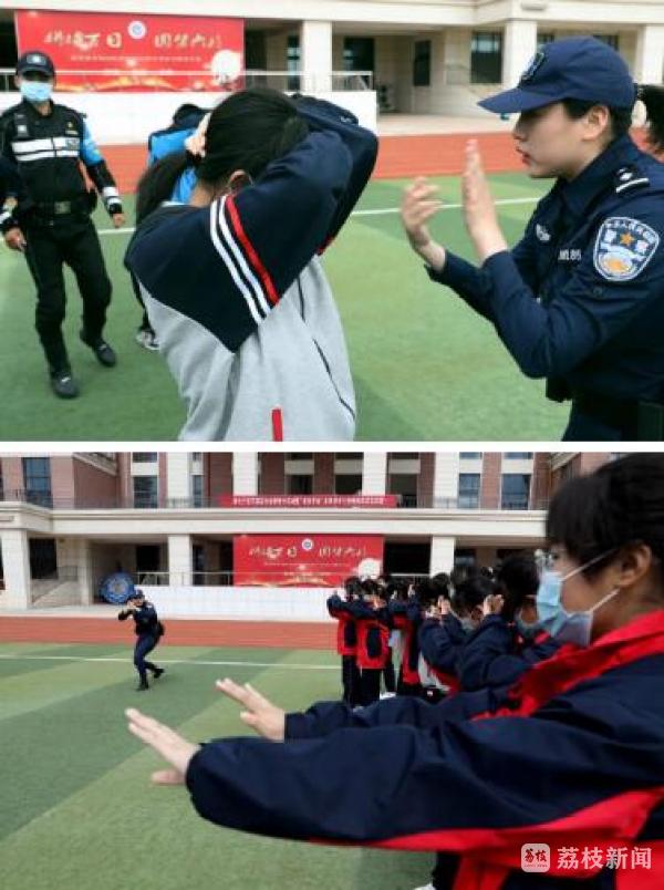 随后,民警就遇到危险时安全距离的把握、观察重点就便器材的选择等方面知识进行“学会自我保护”的教学互动。通过游戏的方式,增强学生发现危险的敏感性,提升反应速度。为了让学生在受到侵害时更好地保护自身安全,民警就特殊情况下如何利用身边的物品开展防御防护进行讲解,并就遇到不法分子防御和挣脱两方面分别示范了一套动作——360头盔防护与跳水式剥离。在民警的现场示范和纠正下,参训学生掌握了简单的防身小技巧。